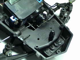 シャシー側も、ダンパー取り付け部をカットしておきます。 既にダンパーステー用の3mmビス穴を開けてしまっていますが、「開け方」なんてものはなくて、 単にステーの現物を当てて穴位置にピンバイス立ててそのまま穴を開けました、みたいな。 ボディマウントが目印になるのでセンター出しはいたって容易です。 いたって安易でOKです。ただし2点止めなので2つ目の穴位置ですべて決まってしまうので、 2個目の穴開けはステーが斜めにならないよう、ちょっと慎重に。 |